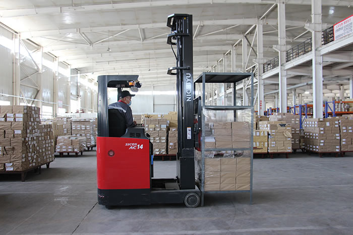 上圖為庫房搬遷現(xiàn)場叉車裝卸圖書 搬遷期間,每天早上7點,貨品便由重型貨車陸續(xù)運往園區(qū)內,伴隨著貨品的陸續(xù)到位,防塵膜拆封,叉車裝卸,入庫碼放,移庫上架,大家加班加點,分工協(xié)作,積極落實圖書的轉運、入庫工作,保證了貨品安全無誤的轉移??焖俑咝У男袆恿蛯I(yè)的工作精神獲得了客戶的一致好評。